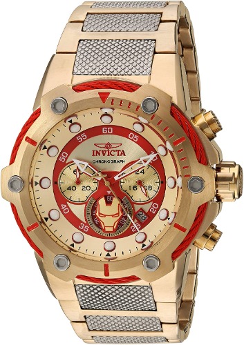 ゴールド×レッドカラーのツートーンカラーがかっこいいと好評の腕時計で、6時の位置にはアイアンマンのフェイスデザインが施されています。