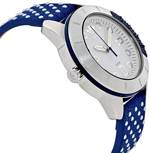 どんなライフスタイルにも使用できるクールなデザインで、男女兼用のユニセックスモデルの白い腕時計です。レザーストラップは白青のドット模様が特徴的で、大きすぎず小さすぎず、腕元に絶妙に馴染むケースサイズです。