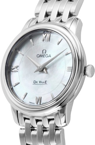 オメガの「424.10.27.60.05.001」は透明感のあるシェル素材が文字盤に採用されたレディース腕時計です。