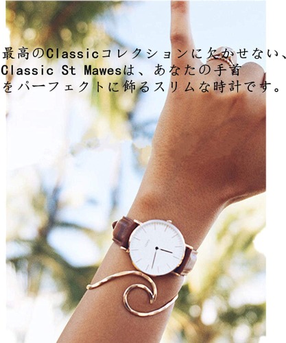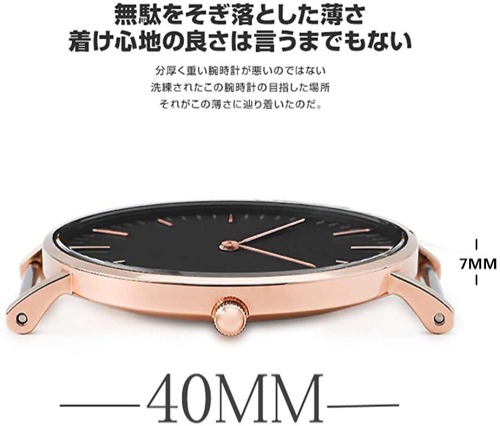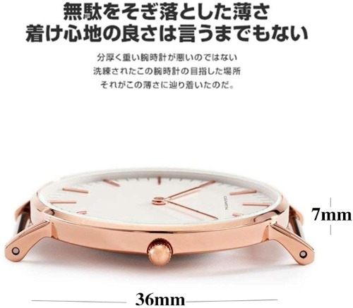 評価:仕事用でも普段のお出かけ用にも使えるお洒落な腕時計を探していて、こちらの腕時計のデザインが気に入ったので購入しました!思っていたより高級感があって大満足です。付けてみると確かに薄型で軽く、一日中付けていても疲れなかったです。職場に付けていくと、友達からも可愛いと言ってもらえたので嬉しかったです。