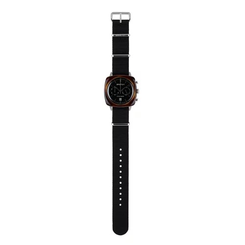 戦闘機に並ぶ計器類からインスパイヤされた文字盤、戦闘機の尾翼のような大型竜頭(リューズ)、ブラック×ブラックの武骨なカラーが戦闘機の操縦室を思わせるデザインです。