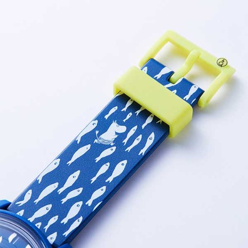 腕時計の表面に描かれているのは、『ムーミン谷の夏まつり』の挿絵で、24人のママがいない子どもたちを連れて野原を歩くスナフキンの姿。