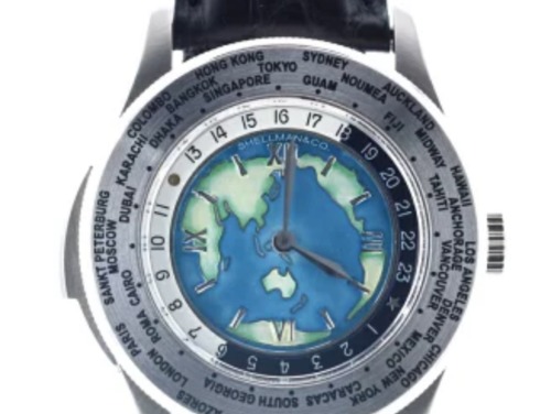 ベゼルに世界の主要都市が表示されていて現地時刻が分かるようになっており、地球儀が入っているようなグローバル感がある文字盤が特徴的なレアなシェルマン(SHELLMAN)のメンズ時計です。