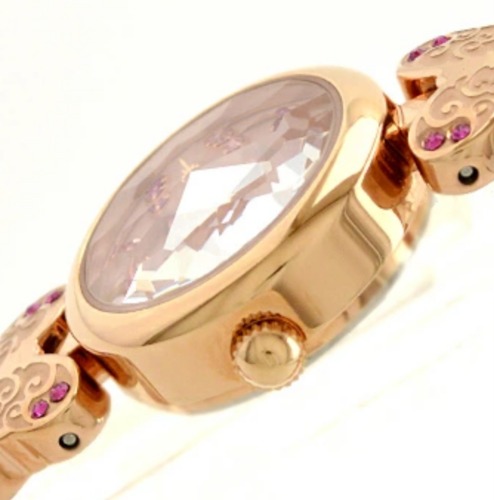 評価:ゴールドカラーのケースとベルト、そして淡いピンク色の文字盤にビビットなピンク色のスワロフスキーが装飾されていて、アナスイらしい可愛らしいフェミニンな世界が出ている腕時計です。見ているだけでワクワクするので、着用していない時は部屋のインテリアにもなります。ちょっと若い感じがするデザインですが、自分が気に入っているので年齢を重ねても愛用していきます。