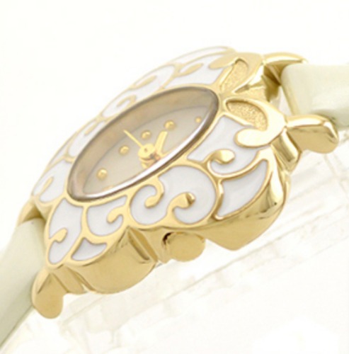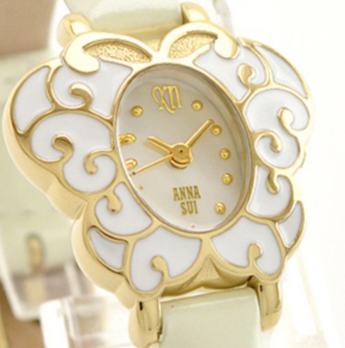 ホワイトカラーとゴールドカラーの爽やかでゴージャスな雰囲気がある、蝶々の形をしたケースが特徴的なアナスイのレディース腕時計です。カーフレザーが使用されているので、着用するごとに肌に馴染んできます。
