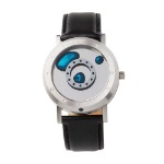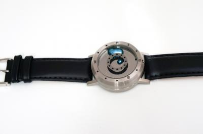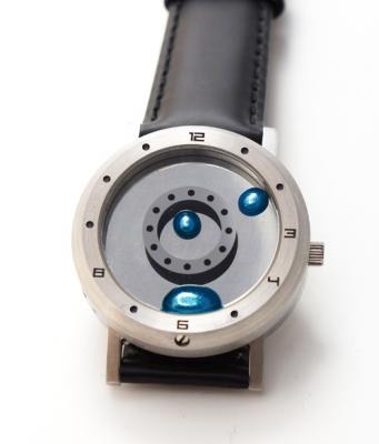 ブルーカラーに着色された水銀の粒が印象的な神秘的な腕時計です。