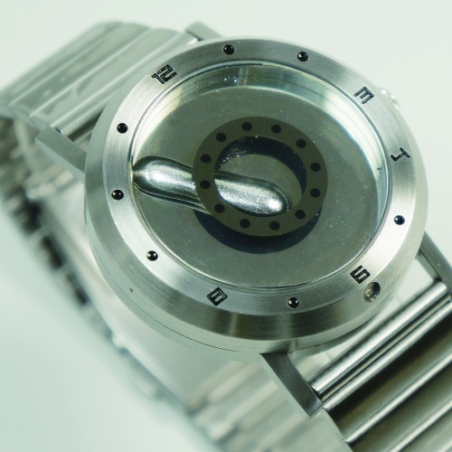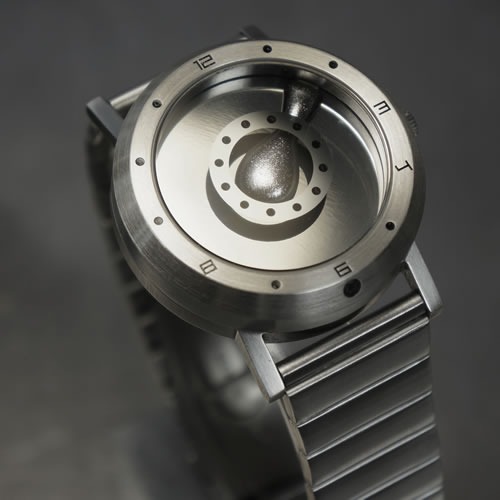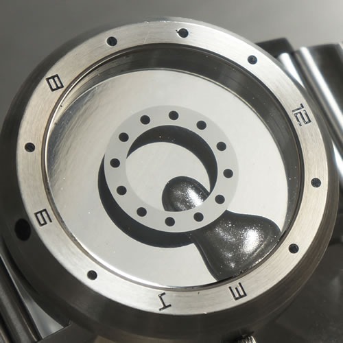 この腕時計の文字盤に輝く液体は、水銀です。