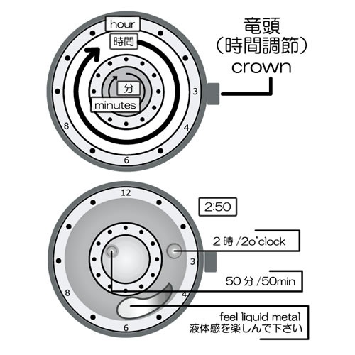 水銀は、常温(室温)でも液体として存在できるため、文字盤の中を自由自在に形を変えて動きます。