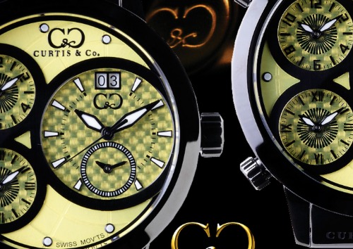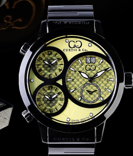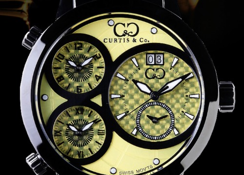 イエローカラーの文字盤にクロノグラフが搭載された他のブランドにはないユニークなデザインが特徴的なカーティスのメンズ腕時計です。