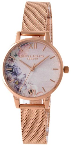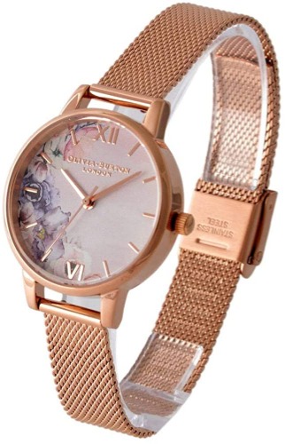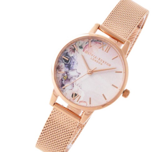 オリビアバートンの腕時計は文字盤に花柄やアニマル柄など可愛らしい絵柄がプリントされているのが特徴的で、こちらのモデルは淡い紫とピンクカラーの花がプリントされています。フェミニンですがゴールドカラーのステンレス製ケースとベルトで、高級感と上品さも出ているレディース腕時計です。