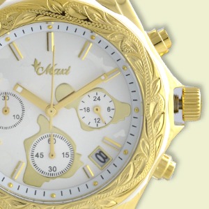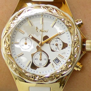 ゴールドカラーのベゼルには、手彫りでハワイの植物たちをモチーフにした細やかな彫りが施されています。