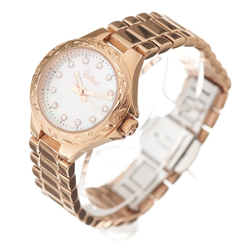 ピンクゴールドカラーのベゼルにもハワイアンジュエリーの象徴、オールドイングリッシュ柄をきめ細かに彫り込みました。