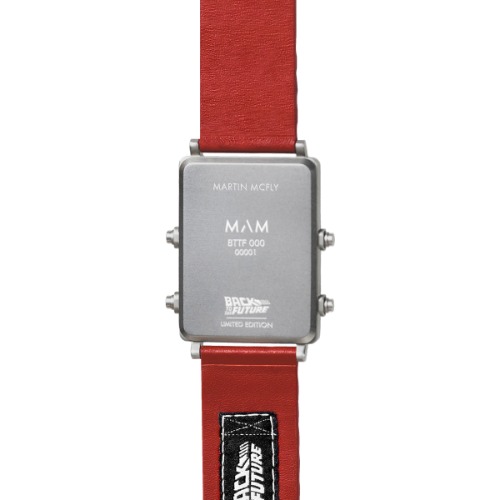 バックトゥザフューチャーとコラボしたMAM(マム)から発売されている腕時計のベルトは、主人公が作品の中で着用している赤いダウンジャケットからインスピレーションを得て作られています。