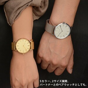 特徴 | ・風防ガラスにインデックスが 印字されている ・木製文字盤使用 | ・ステンレスにツヤ消しダメージ 加工でヴィンテージ感をプラス | ・5カラー2サイズをペア展開 ・ケース、文字盤、メッシュ ベルトが同色になっている |