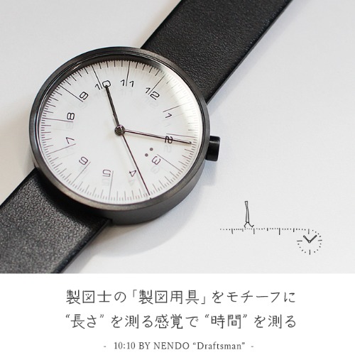 10:10 BY NENDOのdraftsmanは、定規で時間を測るという発想から、インデックスが定規デザインになっている腕時計です。