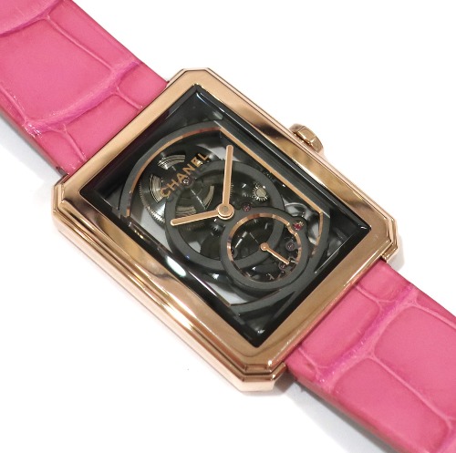 ピンクカラーのアリゲーターが使用されたフェミニンでありながらボーイッシュなデザインのシャネル腕時計です。文字盤がスケルトンになっており中のムーブメントを見ることができます。