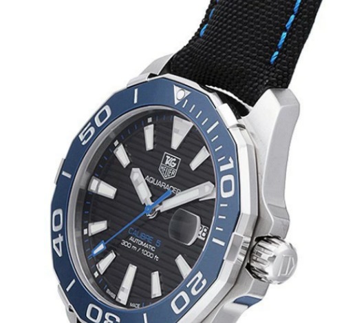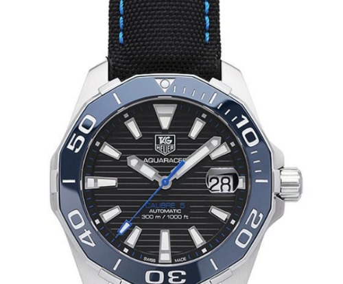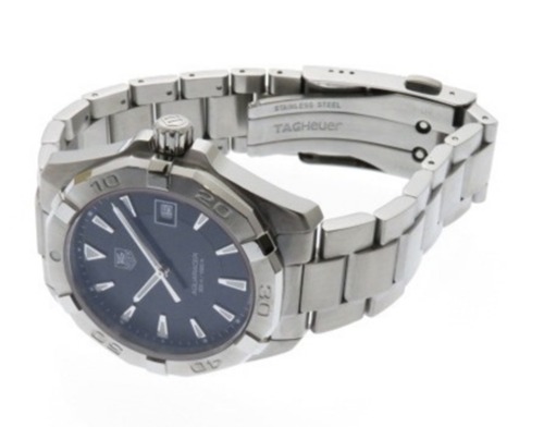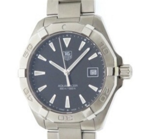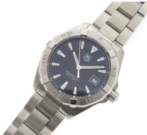 ブルーカラーの文字盤でスポーティーで爽やかな印象があるタグホイヤーのアクアレーサー時計です。重量感のあるモデルでスーツやカジュアルなファッションにも合います。