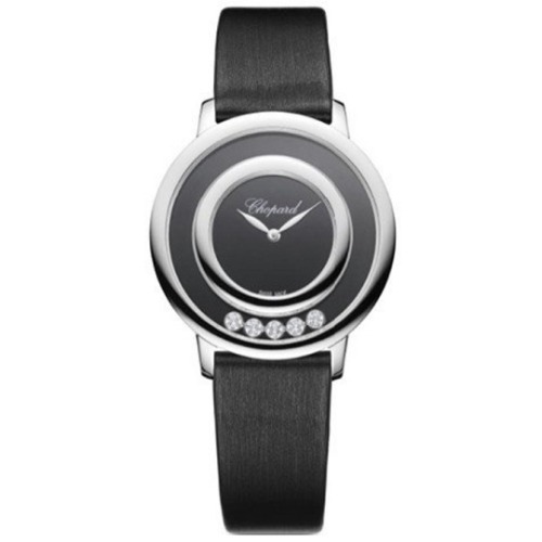 ショパール(Chopard)のハッピーダイヤモンド 209429-1102は、ブラックの文字盤にブラックのブレスレットを持つ腕時計です。