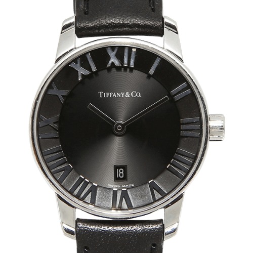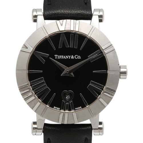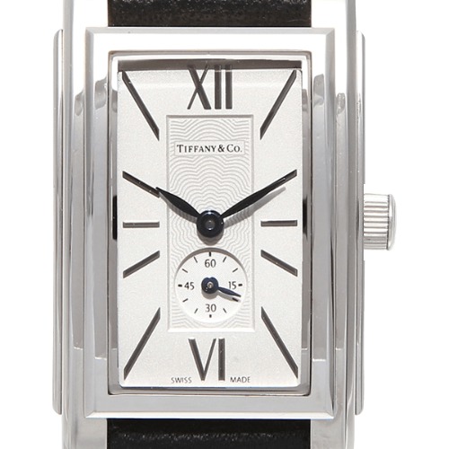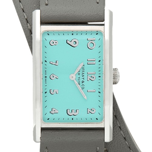ブラックのベルトとホワイトの文字盤が使用されているシンプルな2トーンをベースにしており、ティファニーならではの洗練されたデザインが特徴的なドレスウォッチです。リューズの先端にはブルーの天然石が施されており、ジュエリー感覚で着用することができるレディース腕時計です。