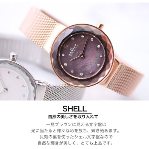 ゴールドやブラック・ピンクゴールド・シルバーの4色が存在し、メッシュベルトが採用されているため、エレガントな印象のレディース腕時計です。