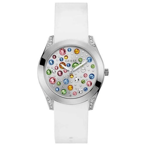 ゲスの「W1059L1」はシルバー×ホワイトのシンプルなカラーデザインですが、文字盤には色とりどりのクリスタルが装飾されています。