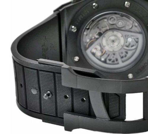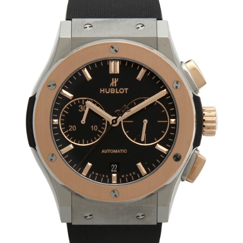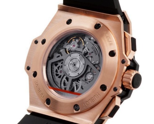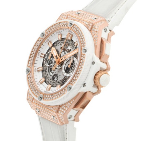 軽量で耐蝕性と耐磁性に優れたシリシウムが採用された、ウブロ完全自社生産のコラムホイール式フライバッククロノグラフムーブメント搭載のゴージャスなモデルです。