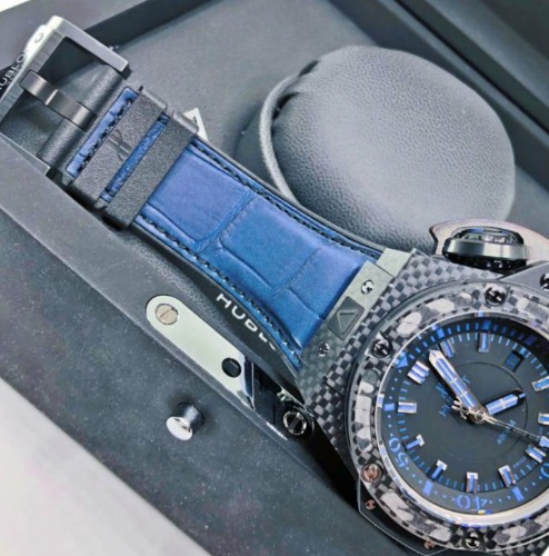 ブルーカラーが文字盤とアリゲーターレザーベルトに使用されており、スポーティーで他のブランドには出せない雰囲気のあるウブロ"キングパワー"のメンズ腕時計です。