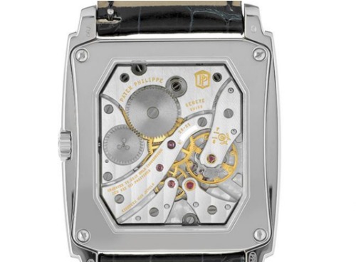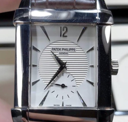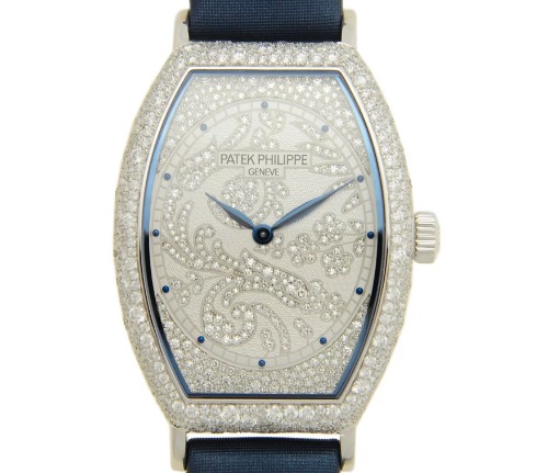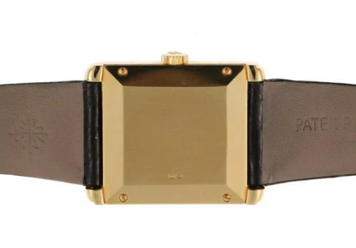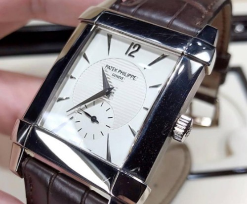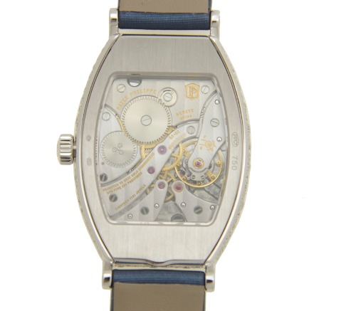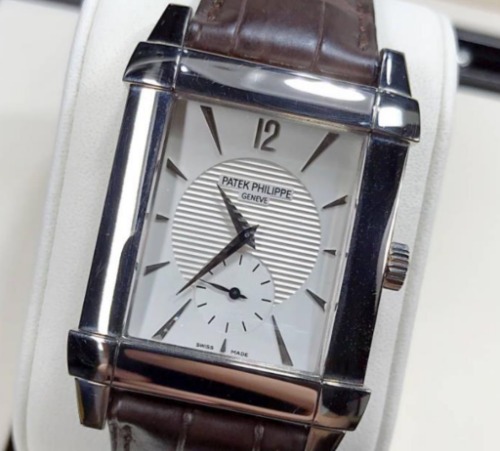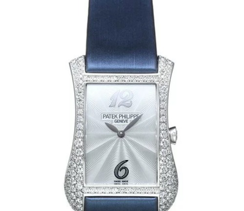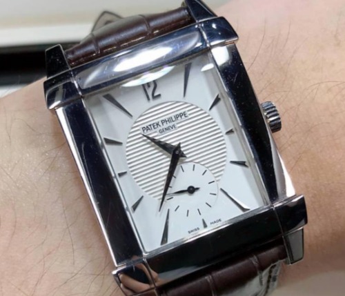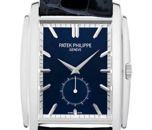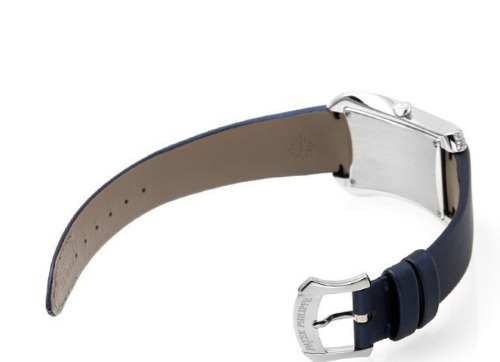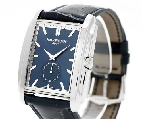 パテックフィリップでは数少ないスクエアケースを採用したゴンドーロシリーズで、ホワイトゴールド素材のケースに深いブルー文字盤が美しい2015年リリースモデルです。