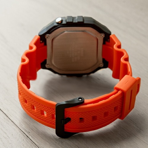 チプカシの「W-218H-4B2」はファッション性に優れている腕時計として人気が高く、オレンジとブラックのコントラストが映えます。