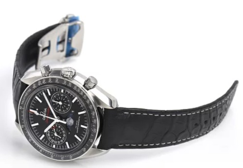 6時位置に写実的で非常に美しいムーンフェイズが搭載されている新型のスピードマスターで、初めてタキメータースケール部分にリキッドメタルを採用した2カウンタークロノグラフが特徴のメンズ腕時計です。