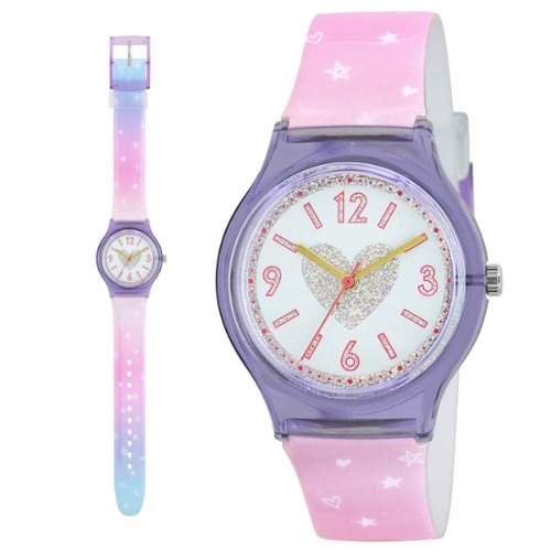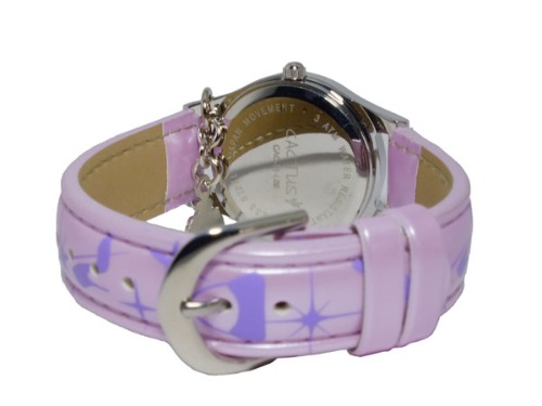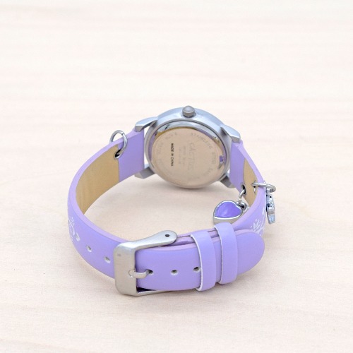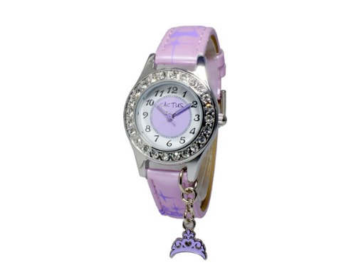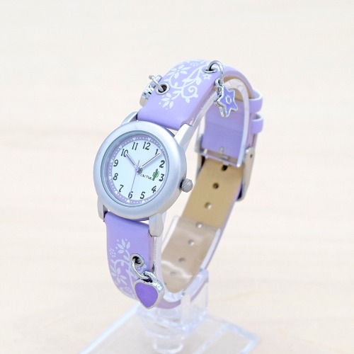 光沢のあるカラーのベルトには、ティアラの形のチャームがついていてアクセサリー感覚で楽しめる腕時計です。