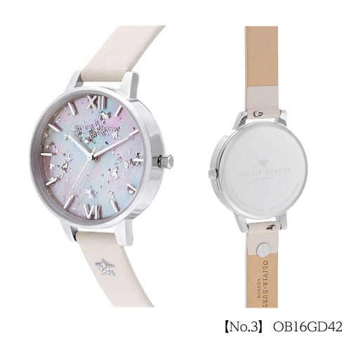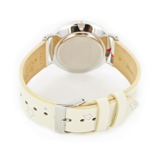文字盤・レザーベルトともにアイボリーカラーで優しい印象ですが、流れ星がとてもカラフルで大胆な絵柄なので注目度の高い腕時計です。