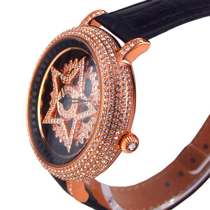 スワロフスキークリスタルは歯車や星のモチーフだけでなく、ベゼルや尾錠、竜頭(リューズ)にもふんだんに用いられて光を放ちます。
