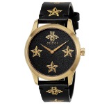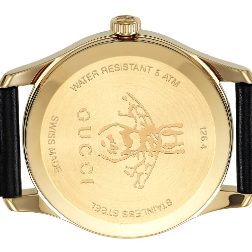 ブラックレザーの文字盤には、12時位置にグッチのハチのエンブレムとロゴがゴールドカラーで入っています。