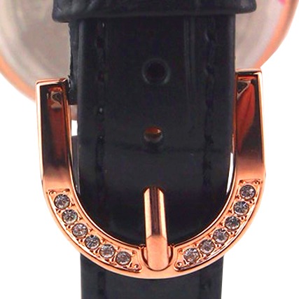 ブラックレザーベルトとブラックの文字盤が、ゴールドとクリスタルの輝きをいっそう際立たせています。