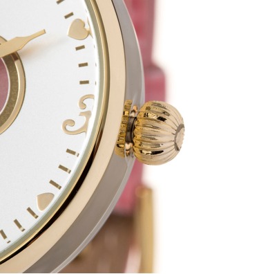 腕時計の中央にはシャイニーなカメリア、インデックスにはさりげなくハートをデザインしています。