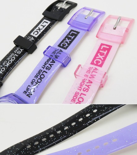 クリア素材が涼しげな印象を与える腕時計です。ラメをミックスさせたベルトにはロゴを飾り、さらに華やかなデザインとなっています。手元のおしゃれにも気を抜かないハイセンスガール必見のアイテムです。日常生活防水や電波機能はございません。