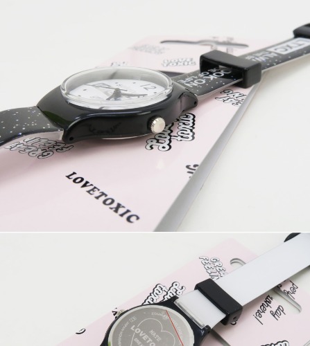 網目のような型押しのシリコンベルトに、文字盤にはおなじみのモチーフで可愛らしいデザインが特徴的なラブトキシック腕時計です。日常生活防水や電波機能はありません。