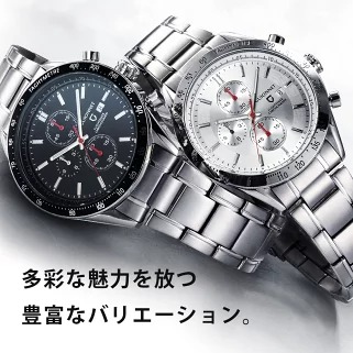 評価:ネイビーxシルバーを購入しました。クロノグラフタイプの時計を初めて買いました。デザインは、光の加減でいろいろな表情を見ることができます。腕に巻いた感じは、重すぎずそれでいて軽すぎず、時計をしていると言う感じです。