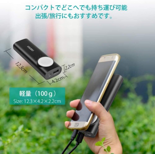 Apple MFI認証取得済みなので安心して充電することができますし、しかも大容量5000Amhなので、フル充電さえしておけばApple Watchとiphoneを同時に充電することもできるので、物凄く役に立ちます。
