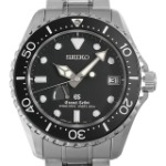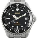 ダイバーズウォッチのブラックカラーで、SEIKOとGrandSeikoのロゴとマークがイエローで入っています。
