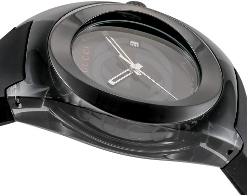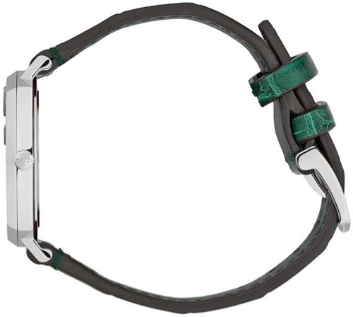 一目でグッチと分かるカラーリングをバンドに施し、ベゼル部分は近未来を感じさせる形状になっています。少し大きめに見えますが、腕に装着するとしっくりなじみます。尾錠に刻印されたGUCCIの文字が、高級感を感じさせてくれる時計です。