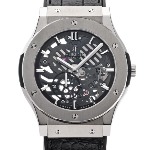 チタニウムの質感はそのままに、スケルトンの文字盤からウブロの美しい複雑機構が楽しめます。