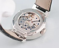 801-EEは、ハンドカットの本物のガラスエナメルスケルトンダイヤルエンジンターン(ギョーシェ)メインプレートとローマ数字とブルースティール針が印象的な時計です。