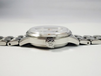ホワイトの文字盤には、6時位置にシリーズロゴ、12時位置にブランドロゴを配置しています。