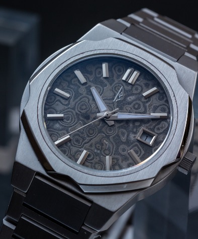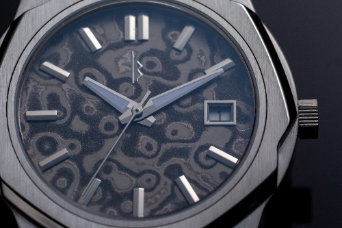 クォーツタイプは従来のダマスカス鋼を文字盤に使用しています。