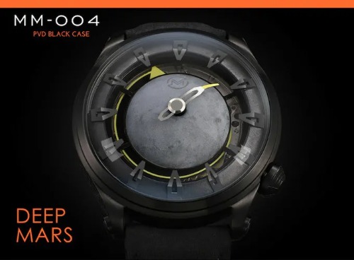 立体的になっている文字盤は光を吸収し、暗い場所では神秘的な火星のように赤く光ります。