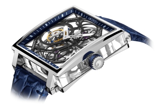 このTHE ARCHERは、風防と裏蓋にサファイアクリスタル、側面には水晶ガラスを使用しています。