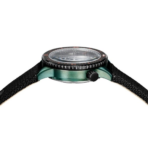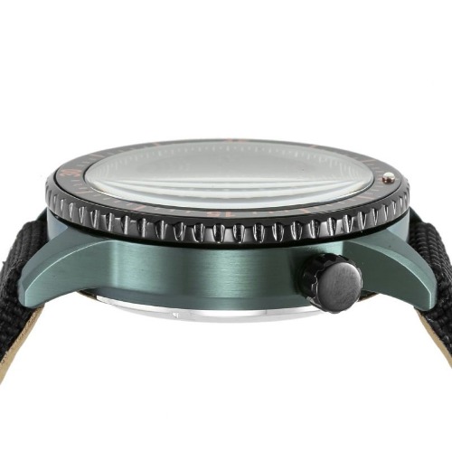 グリーンはケースに、オレンジはインデックスや目盛りにのみ採用しており、ポイント使いをしているので派手すぎません。