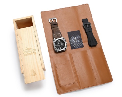 先行販売限定で木箱、Infantry特製腕時計専用ポーチ、交換用ラバーベルトがセットになっています。